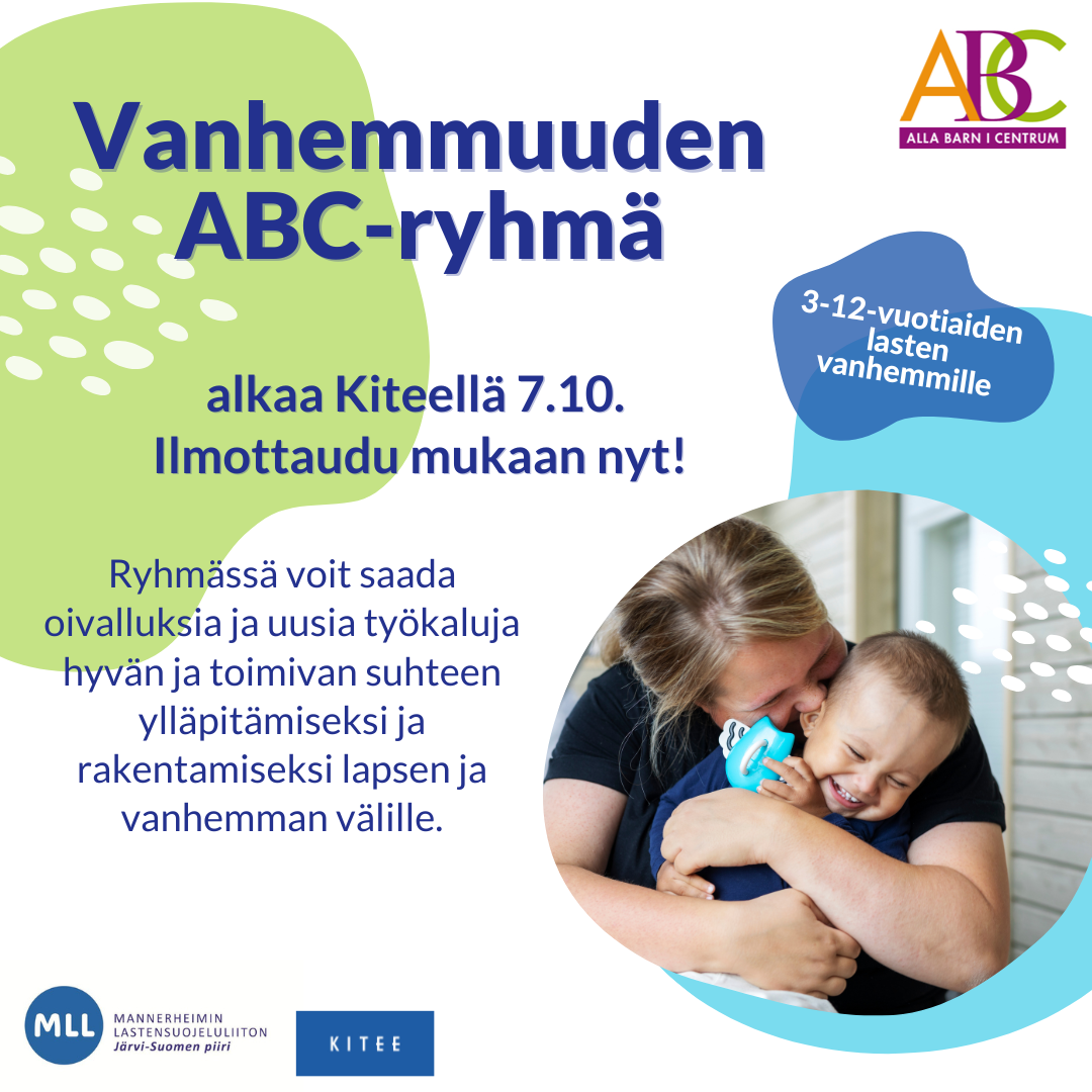 Miten haluat, että lapsesi muistaa sinut 20 vuoden päästä? ABC-ryhmän tavoitteena on tukea lasten positiivista kehitystä vahvistamalla lapsen ja aikuisen välistä suhdetta arjessa. Ryhmään otetaan rajallinen määrä osallistujia ja toivomme, että pystyt osallistumaan kaikille tapaamiskerroille.