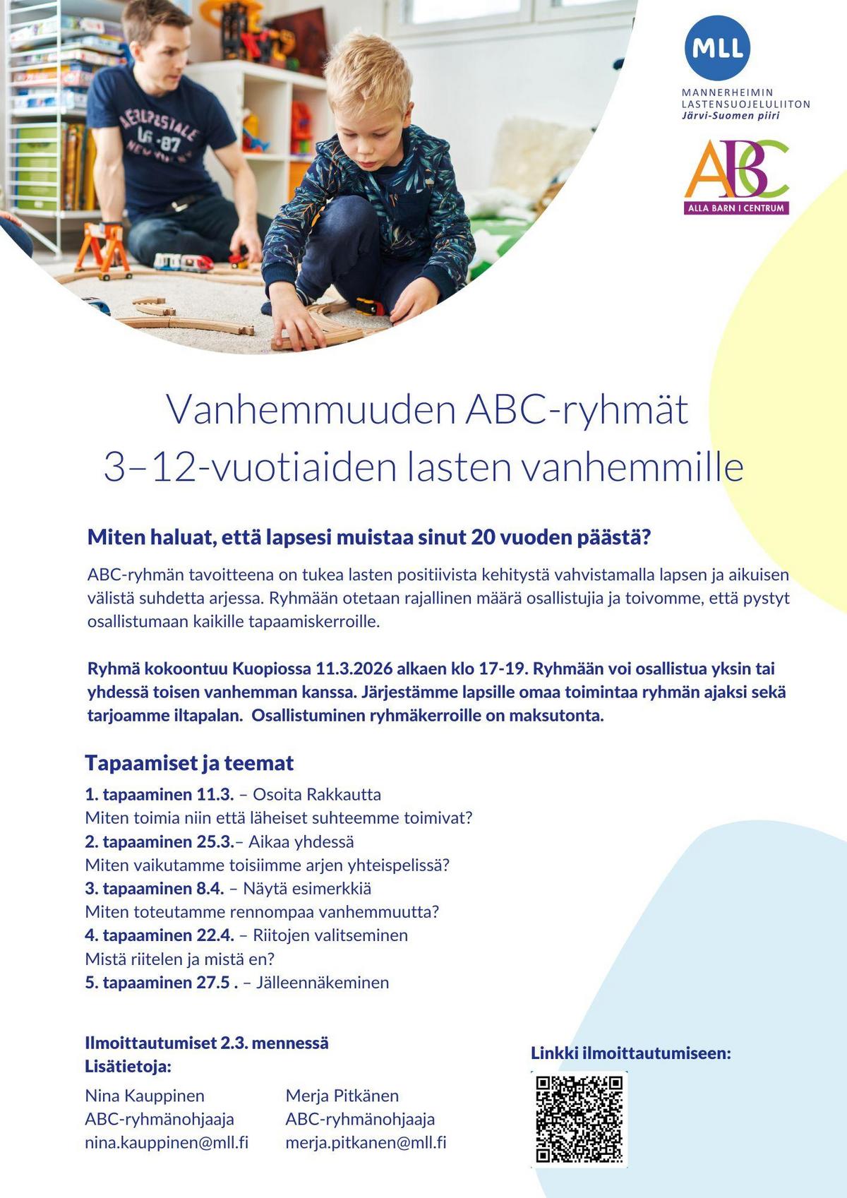 ABC-ryhmän tavoitteena on tukea lasten positiivista kehitystä vahvistamalla lapsen ja aikuisen välistä suhdetta arjessa. Ryhmään otetaan rajallinen määrä osallistujia ja toivomme, että pystyt osallistumaan kaikille tapaamiskerroille.